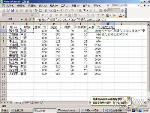第一步:打开工资表,在实发工资下面输入=IF(B2=“初级”,G2+20,IF(B2=“中级”,G2+50,IF(B2=“高级”),G2+70))。