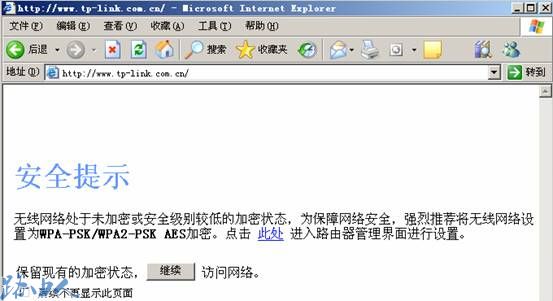 基本TP-LINK所有型号的无线路由器都增加了防蹭网安全提示页面,这正是为了抵御越来越猖獗的蹭网行为,提醒广大TP-LINK用户注意无线网络安全。如下图所示:
