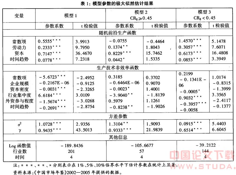 表1显示,随机前沿生产函数中参数估计系数的符号与理论预期的完全一致。三个模型中资本的产出弹性皆显著地高于劳动的产出弹性,说明在我国201个四位码制造业行业中,不同市场竞争程度下本地企业生产中资本对产出的贡献皆大于劳动的贡献;尤其是在市场集中度超过0.45的57个垄断程度较高的四位码行业中,资本的产出弹性高达0.8229,显示资本在该行业生产中起了决定性作用,这与我们的理论认识相一致,即高垄断行业基本上为资本密集型产业,资本投入在生产中的作用至关重要;所有模型中时间趋势系数皆显著为正,说明2000—2003年我国201个四位码制造业行业本地企业技术进步的年均增长率为7.78%,而市场集中度的57个高垄断行业,本地企业技术进步的年均增长率仅为 4.42%,远远低于竞争程度高(CR8<0.45)的144个行业本地企业技术进步的年均增长率(8.55%),这一经验结论与经济理论即垄断的存在阻碍企业的技术进步完全吻合。