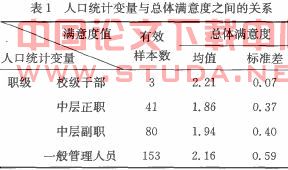 1.不同职级的管理人员和总体满意度之问关系的探索眭统计分析结果如表1所示。