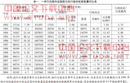 在行政诉讼受案数量不多、发展低迷的情况下,人民法院执行行政决定的数量却比较高,1994年至2004年这十一年问,执行行政决定的比例占执行案件总数的比例都超过了百分之十。1999年至2002年执行行政裁判的案件数量连续出现了负增长。出现这种情况的原因,与行政诉讼案件总体下滑的现象有关;当事人主动执行人民法院的裁判,以致执行法院裁判案件的数量大大下降;在某种程度上,新司法解释规定了对申请执行行政决定的案件进行严格审查也与执行案件数量下滑有一定关系。在总体上,申请执行行政决定案件的数量在绝对数量上远远高于审判案件的数量。1998年以前,前者是后者的三到六倍左右;1999年至2004年,前者是后者的十倍多,2002年和2003年达到了,二十倍。