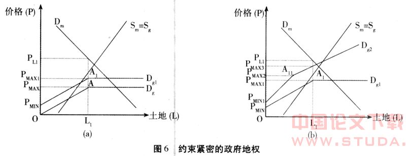 图7(a)表明了“约束松散的农民地权”导致土地资源浪费的情况。由政府和农民组成的供给曲线Spg由于上述的原因而趋于平缓,弹性增大,由Spg向下移至Spg1,形成新的供给曲线。表明土地市场上局部均衡点下移,由D移至正点。均衡价格从P下降至P1,从而限制了土地价值最大化,造成了土地资源的浪费。图7(b)则表明厂“约束松散的农民地权”导致土地资源浪费的具体过程。对于土地L,当农民以P1的价格出让土地时,其市场价格为P,而PABP1就是由农民对自已所拥有的地权部分处置不当造成的损失;同样,政府中实际操作者利用手中的部分地权而定的价格为P2,市场价格为P,PACP2就是政府对自己所拥有的地权部分处置不当造成的;当政府将土地定价为P1时,农民定价为P2,如果最后选择的价格为P2,则是农民“侵蚀”了政府的地权,会多增加损失P1BCP2;相反,如果农民将土地定价为P1时,政府定价为P2,如果最后选择的价格为P2,则是政府“侵蚀”了农民的地权,会多增加损失P1BCP2。可见,由于农民与政府自身对地权把握失度及二者相互侵权导致了土地资源的浪费。而这一切的发生均是由于地权分割后对地权不同部分所有者的约束不当造成的。