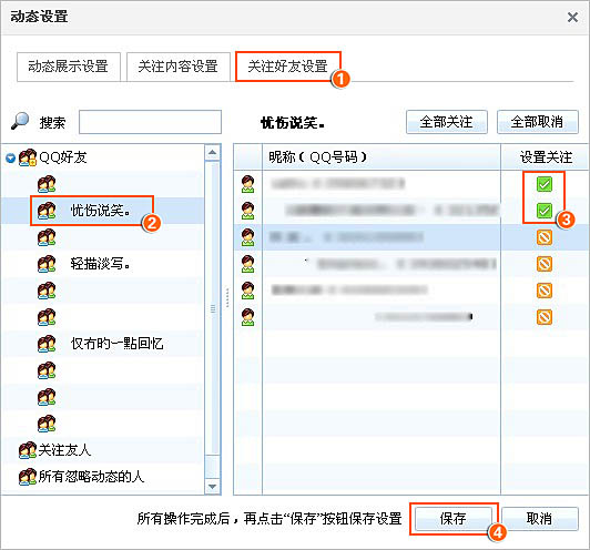 查找忽略过动态的好友,用搜索QQ号、分类查找、所有忽略动态的人都可以,找到好友后面忽略“”的图标,显示为关注“”状态进行“保存”;