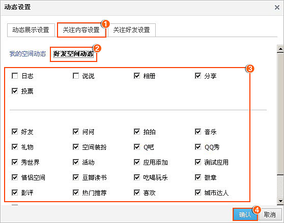 选择‘关注内容设置’,可以自定义选择您想关注好友空间的类别前打上勾,最后“确定”即可。